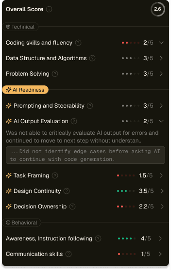 ☉ Dimensional Scoring: AI fluency, technical depth and more